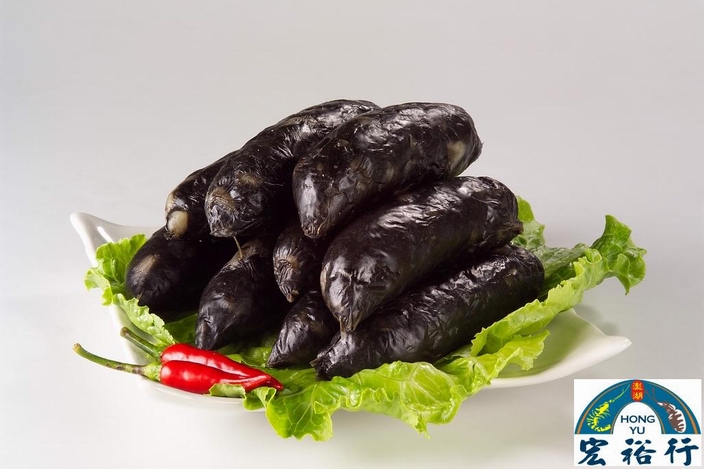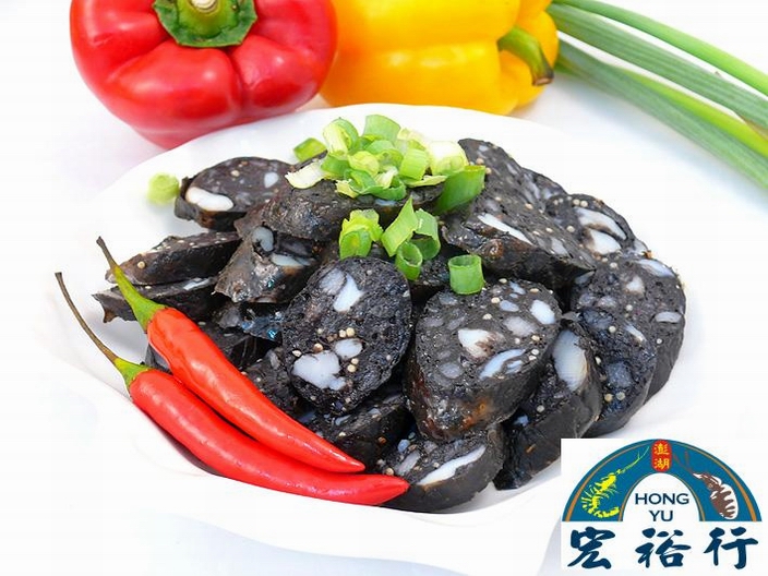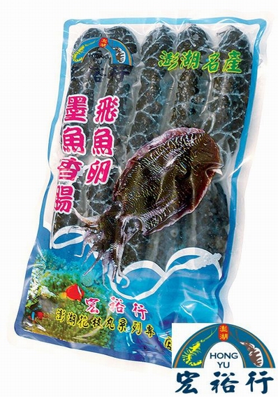 飛魚卵墨魚香腸系列為宏裕行最新研發成功的熱門產品,主要原料都是新鮮、天然的食材,製作過程完全不添加任何色素,產品會呈現深黑色是因為加了直接取自新鮮花枝的墨汁所致。 真材實料!秉持宏裕行一貫札實用料的風格,採用產自澎湖的頂級去皮新鮮花枝及其墨汁,加上東北角的無污染金黃色飛魚卵,完美地結合了墨魚的鮮甜與飛魚卵的Q脆,口感更加豐富,消費者更能享受來自大海最原始、最天然的香甜鮮Q口感。 料理簡單!冷油煎熟,切片即可食用,碳烤風味更佳!熟食香甜,冷食鮮Q,吃起來不油不膩,十分爽口。是團圓聚會的最佳良伴,更是年節送禮的不二選擇!